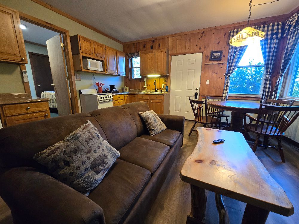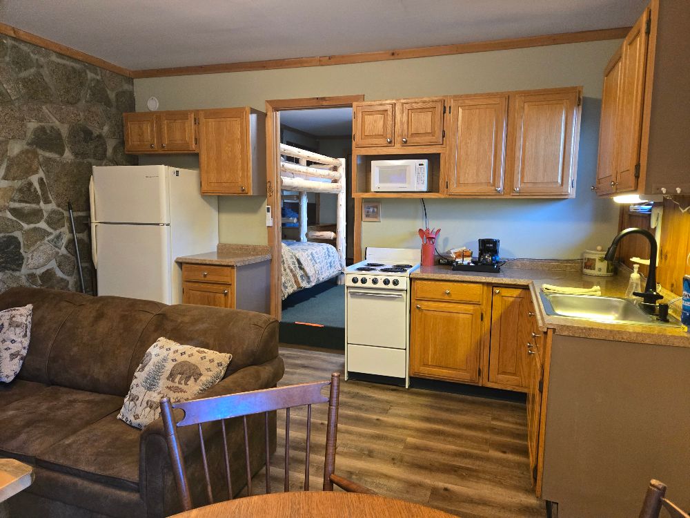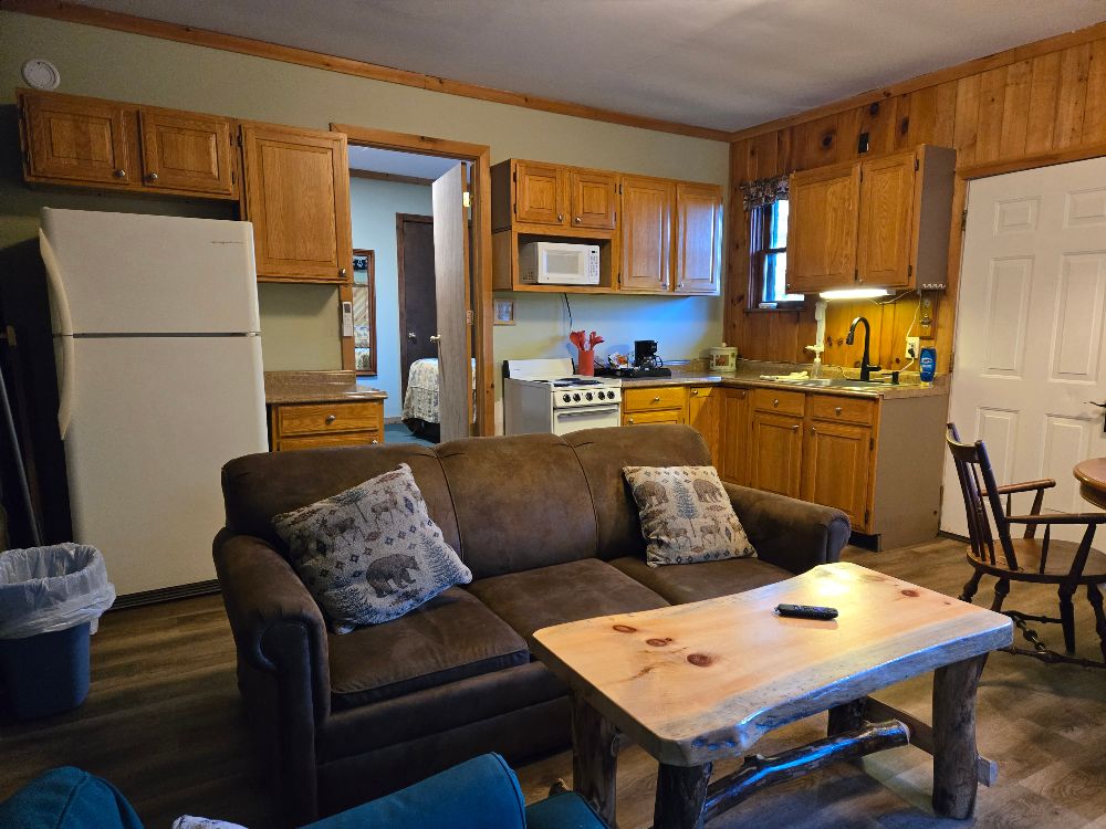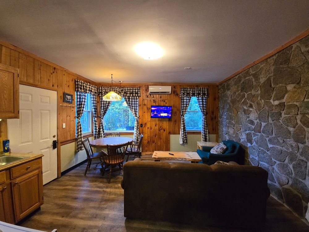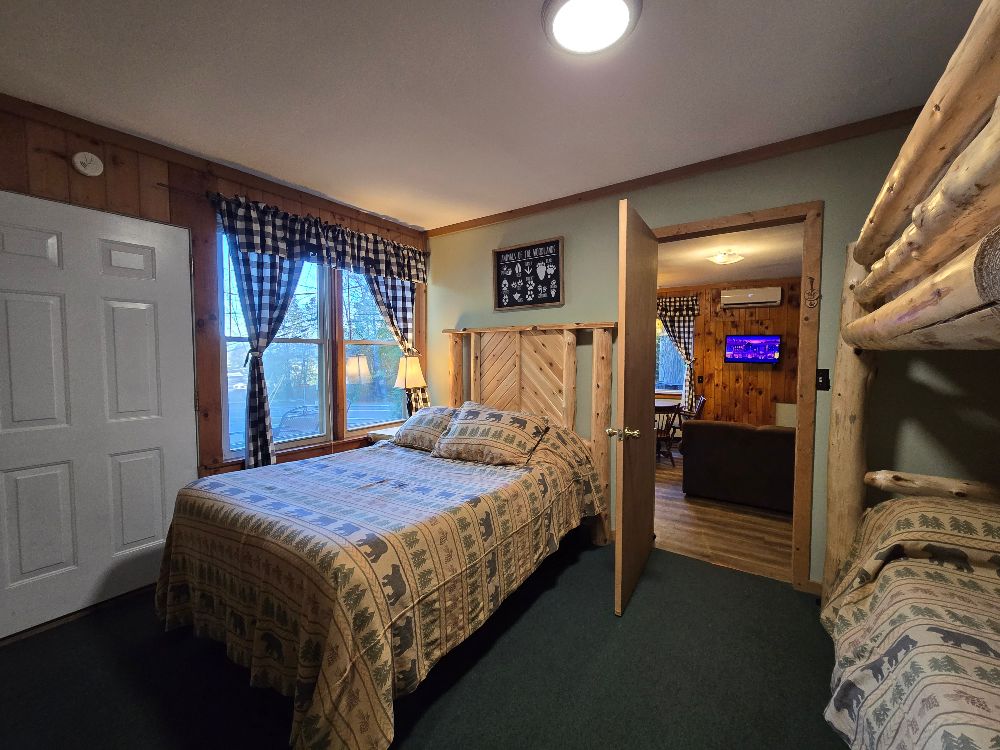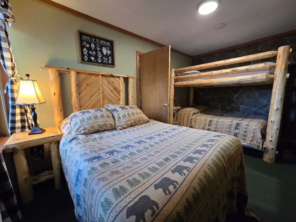 NEW for 2025 – our combination accommodation that joins the Beaver Lodge & the Beaver Dam room together to offer two bedrooms, two baths, full kitchen, dining area, living area, ductless heat pump A/C and heating, beds for 7 and a sleeper sofa for extra space! Small patio, tables and chairs, as well as a Solo fire pit outside. The two bedrooms are separated by adjoining doors. Bedroom 1 has two full beds and one twin bunk over one of the full beds, sleeping 5 in the same room with an ensuite bath that includes a full tub/shower. Bedroom 2 has a queen bed and the ensuite bath with stand up shower, and offers its own private space. This is not a stand alone cabin, but is a wing of the main lodge located on the corner of Vito Rd and Lake Shore Drive, with no other Guests above or below . Dedicated parking for 4 cards right out front. Great for larger families looking for a longer stay on a budget!