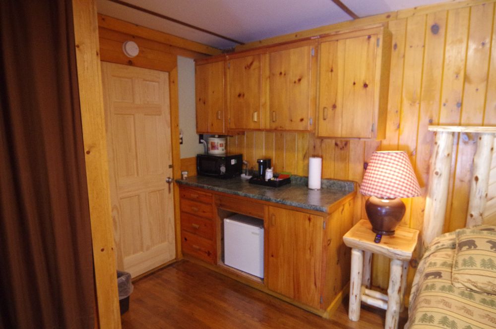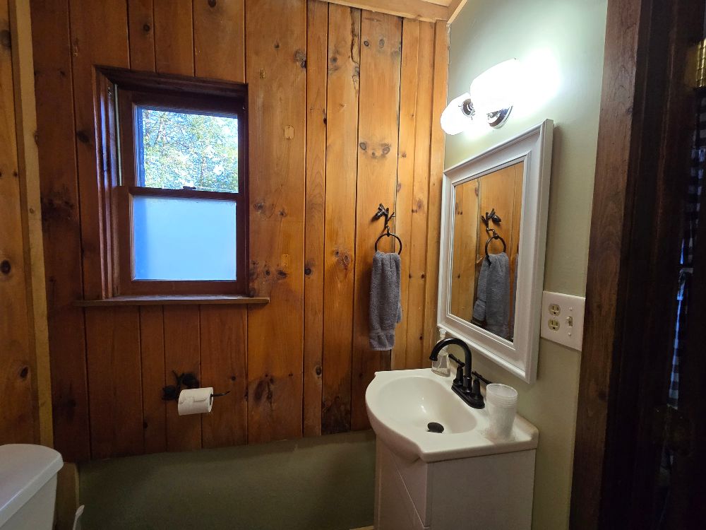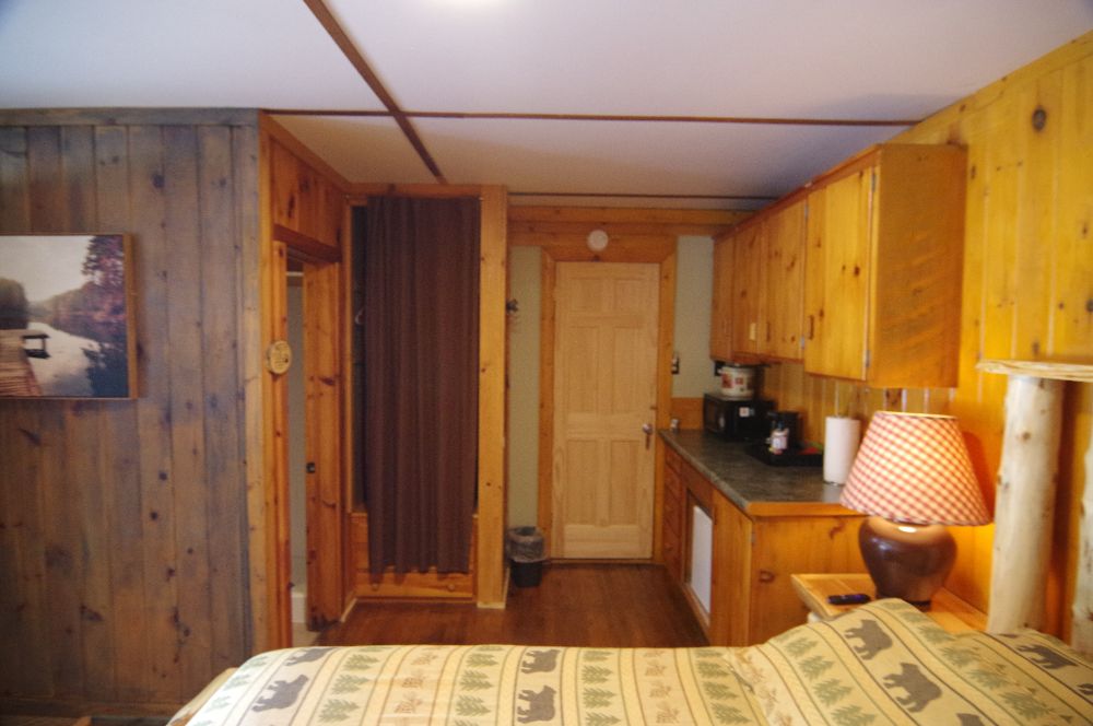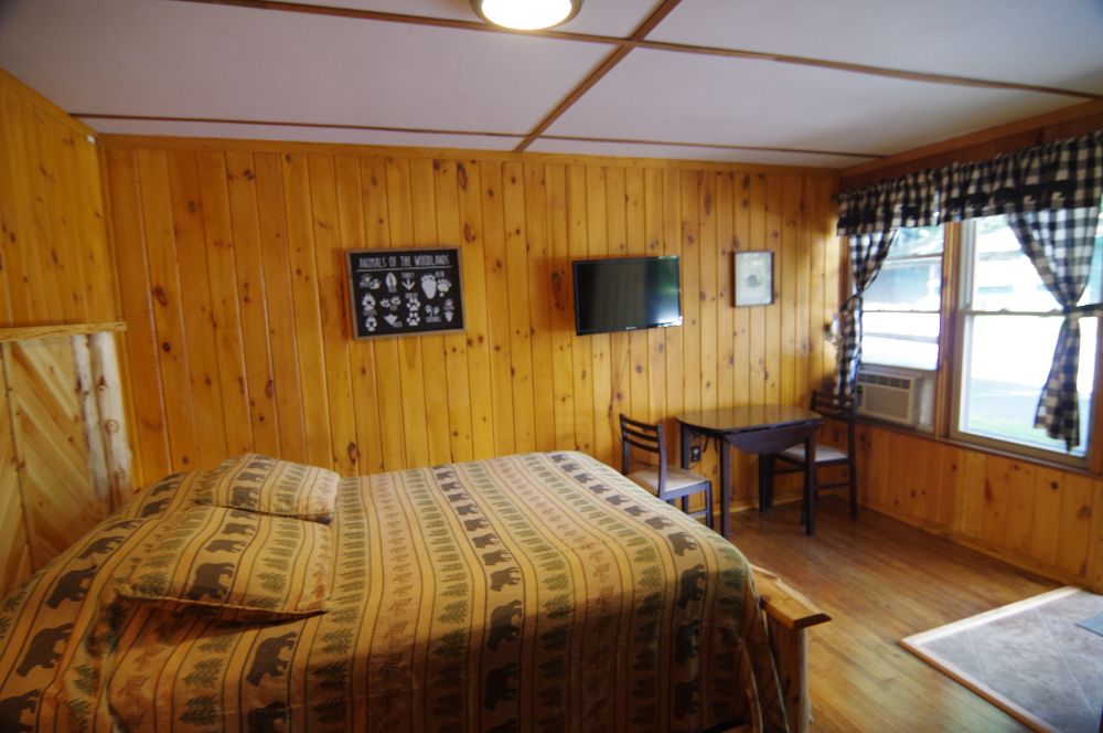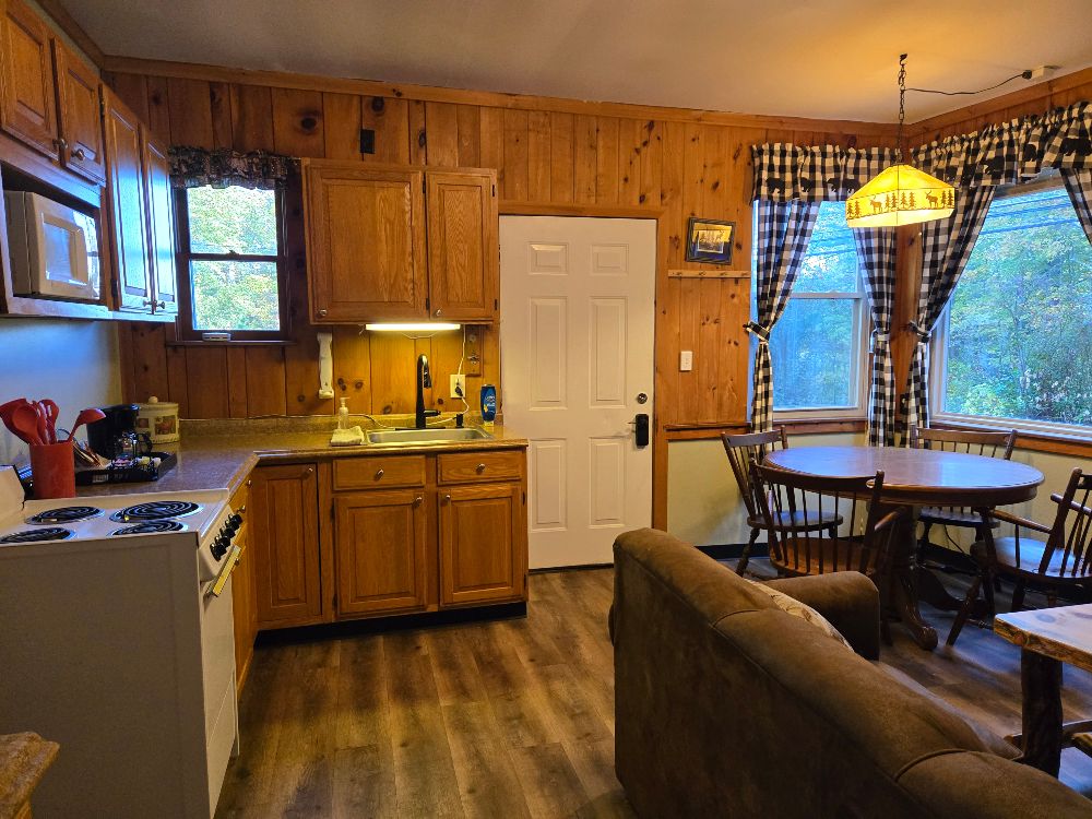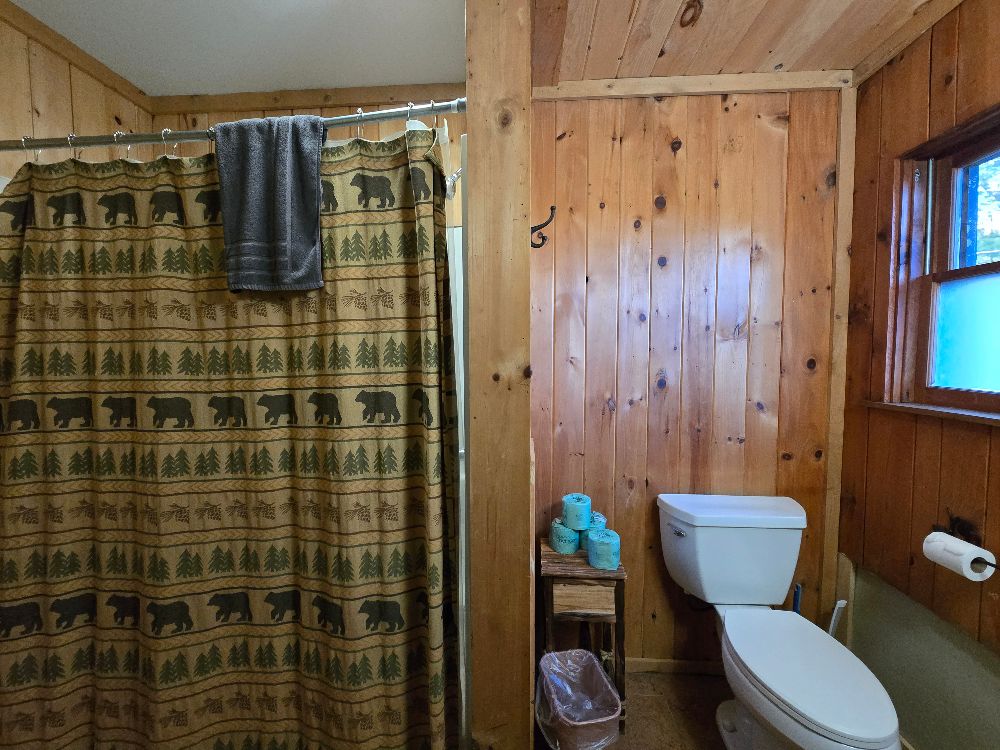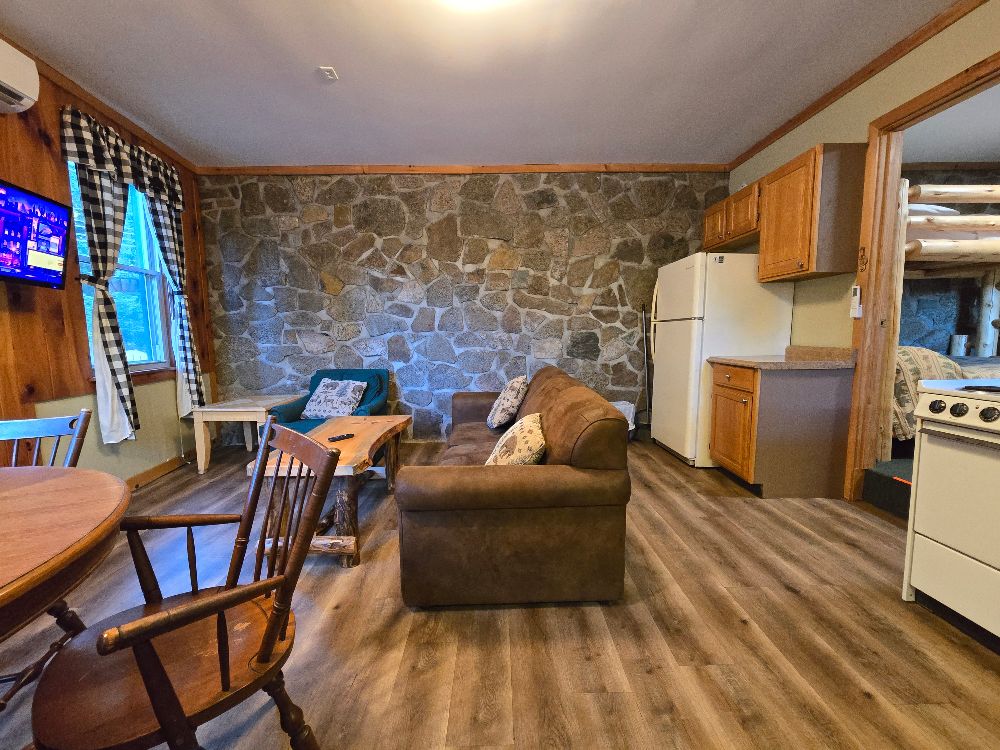 NEW for 2025 – our combination accommodation that joins the Beaver Lodge & the Beaver Dam room together to offer two bedrooms, two baths, full kitchen, dining area, living area, ductless heat pump A/C and heating, beds for 7 and a sleeper sofa for extra space! Small patio, tables and chairs, as well as a Solo fire pit outside. The two bedrooms are separated by adjoining doors. Bedroom 1 has two full beds and one twin bunk over one of the full beds, sleeping 5 in the same room with an ensuite bath that includes a full tub/shower. Bedroom 2 has a queen bed and the ensuite bath with stand up shower, and offers its own private space. This is not a stand alone cabin, but is a wing of the main lodge located on the corner of Vito Rd and Lake Shore Drive, with no other Guests above or below . Dedicated parking for 4 cards right out front. Great for larger families looking for a longer stay on a budget!